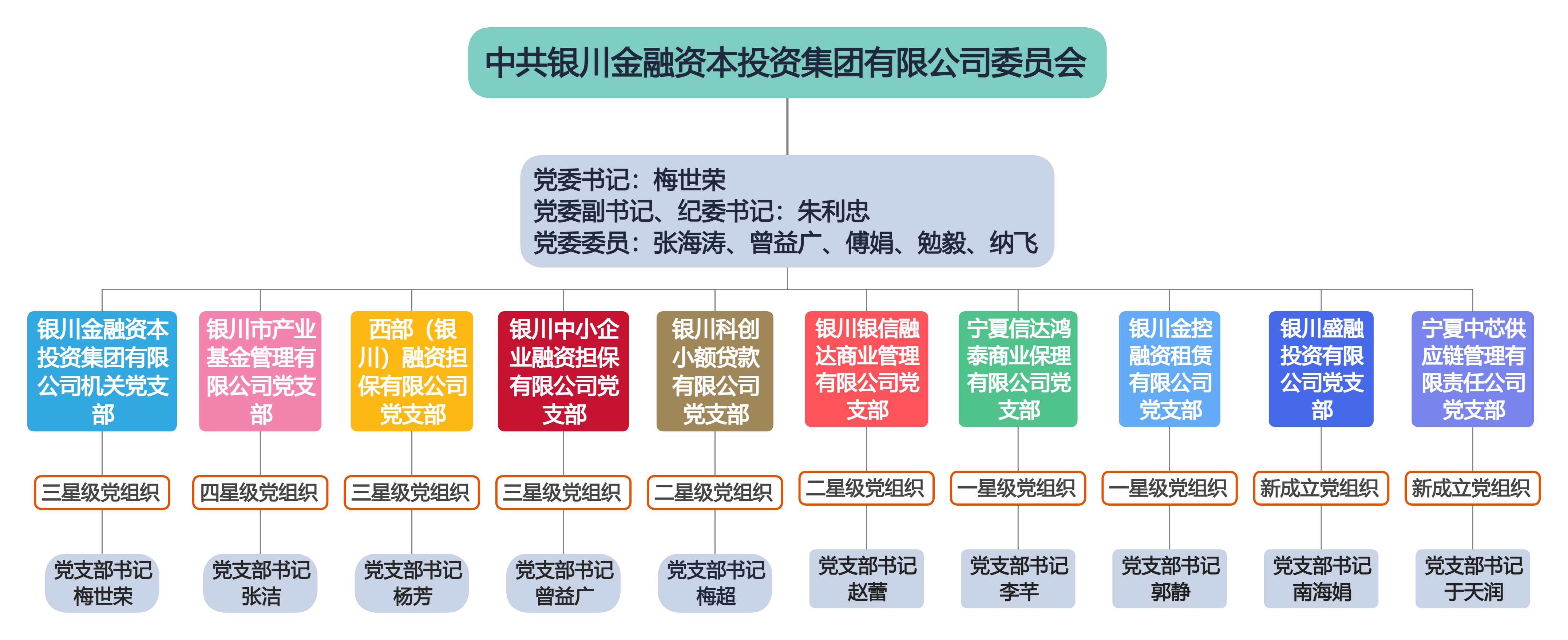 銀川金融資本投資集團(tuán)有限公司黨委于2019年12月6日成立,在銀川市委、市政府及市國資委黨委和市委金融工委的領(lǐng)導(dǎo)下,堅(jiān)持以習(xí)近平新時(shí)代中國特色社會(huì)主義思想為指導(dǎo),堅(jiān)持正確的政治方向,宣傳貫徹落實(shí)黨的路線方針政策,嚴(yán)格按照上級(jí)有關(guān)部署開展各項(xiàng)工作,有效發(fā)揮黨建在企業(yè)經(jīng)營管理中管大局、把方向的政治引領(lǐng)作用。集團(tuán)黨委目前設(shè)立10個(gè)黨支部:銀川金融資本投資集團(tuán)有限公司機(jī)關(guān)黨支部、西部(銀川)融資擔(dān)保有限公司黨支部、銀川市產(chǎn)業(yè)基金管理有限公司黨支部、銀川中小企業(yè)融資擔(dān)保有限公司黨支部、銀川科創(chuàng)小額貸款有限公司黨支部、銀川銀信融達(dá)商業(yè)管理有限公司黨支部、寧夏信達(dá)鴻泰商業(yè)保理公司黨支部、銀川金控融資租賃有限公司黨支部、銀川盛融投資有限公司黨支部、寧夏中芯供應(yīng)鏈管理有限責(zé)任公司黨支部?,F(xiàn)有黨員130人,其中正式黨員123人、預(yù)備黨員7人、發(fā)展對(duì)象5人、積極分子35人。